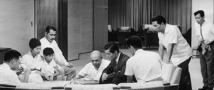 In High and Low, Toshiro Mifune plays Kingo Gondo, a high-powered executive on the cusp of the biggest night of his career. As he prepares to enter the corporate world, a phone call informs him of his son's kidnapping. From there, the film splits in two: the first half unfolds in Gondo’s sleek, air-conditioned mansion—a chamber drama where tension builds like a vice—and the second half plunges us into the streets of Yokohama, following detectives as they comb through the polluted, overcrowded underbelly of the city.